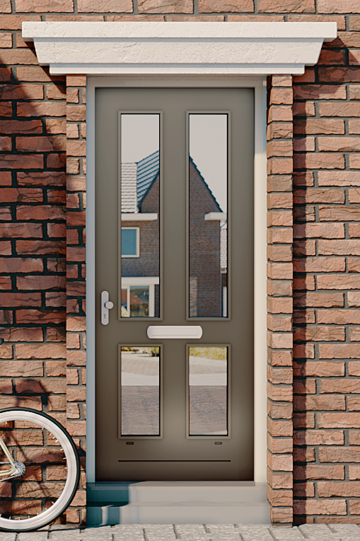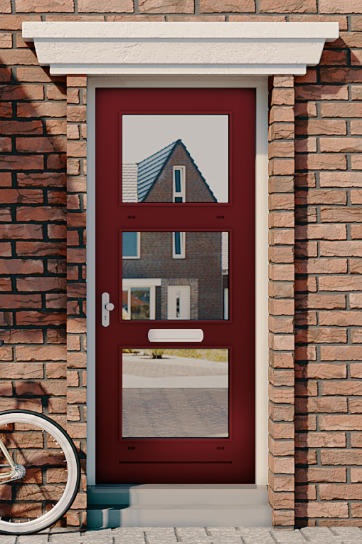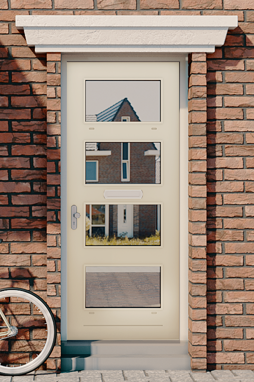 Model 56 is een verfijnde voordeur met vier glaspanelen, verdeeld door drie tussendorpels, wat zorgt voor een robuuste en klassieke uitstraling. De...