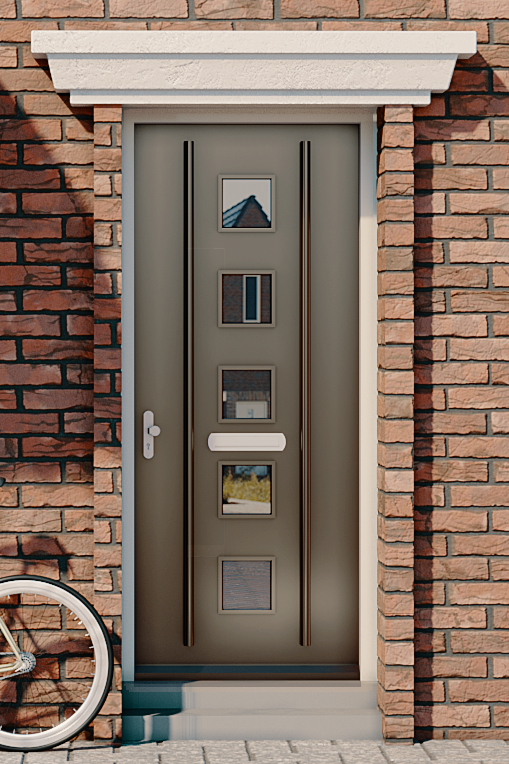 Alle gegevens bekijken611 - Vlakke Voordeur met Vijf Vierkante Glaspanelen en Twee Verticale Sierlijsten