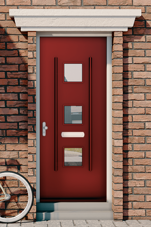 Alle gegevens bekijken614 - Vlakke Voordeur met Drie Vierkante Glaspanelen en Sierlijsten