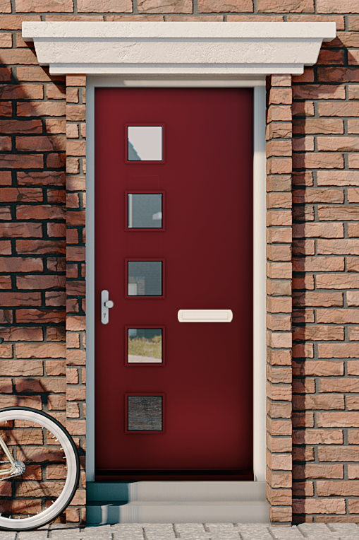 Model 611 combineert een moderne uitstraling met verfijnde details. Deze vlakke voordeur is voorzien van vijf symmetrisch geplaatste vierkante glas...
